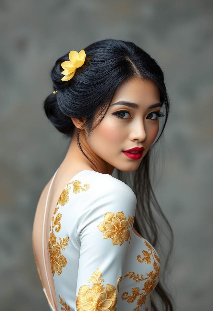 a gorgeous 25 years old asian woman, very pale skin, black very long hair in elegant updo with yellow lotus flower hairpins, long black eyelashes, black mascara, black eyeliner define her big beautiful dark green eyes, golden glittering eyeshadow, luscious sensual pink glossy lips, rouge, sexy curves, big breasts, very long elegant white dress with golden flower pattern, turns her head at viewer sensually and dominantly