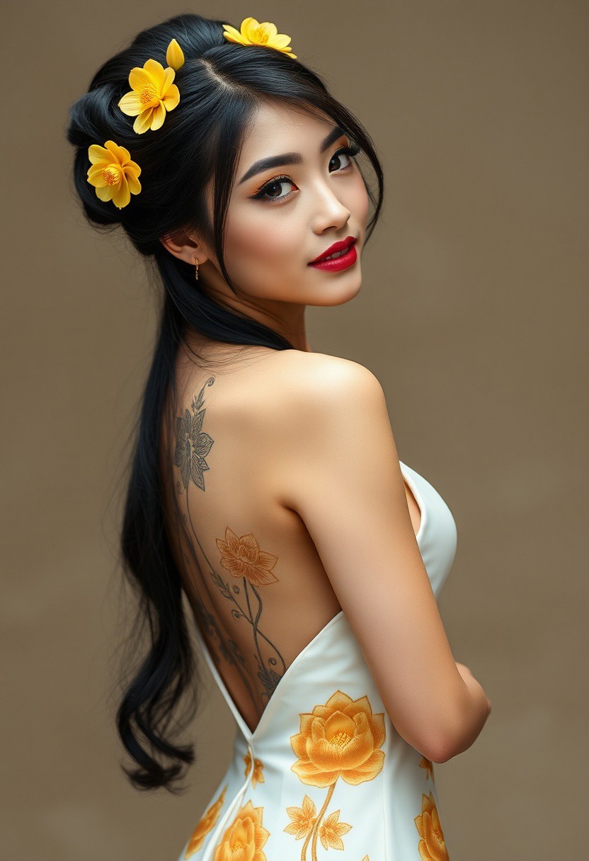 a gorgeous 25 years old asian woman, very pale skin, black very long hair in elegant updo with yellow lotus flower hairpins, long black eyelashes, black mascara, black eyeliner define her big beautiful dark green eyes, golden glittering eyeshadow, luscious sensual pink glossy lips, rouge, sexy curves, big breasts, very long elegant white dress with golden flower pattern, turns her head at viewer elegantly, back large tattoo with lotus flowers, hides her nudity by showing only the back