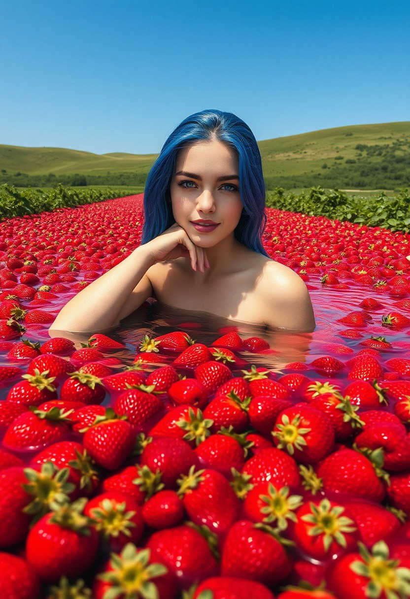 A surreal lake entirely covered with ripe, juicy strawberries, forming a vibrant red surface that glistens under the warm sunlight. In the center of this sea of strawberries, a nude attractive girl with beautiful face and beautiful big blue eyes, long blue hair ending in, drill hair style, swimming gracefully. Her collarbone glistens as she rests her head on her arm, her upper body submerged in the crystal-clear water, creating soft ripples among the strawberries. Her playful expression and relaxed posture reflect the joy of the moment. Around the lake, lush green hills and strawberry bushes stretch into the distance, with the sweet scent of strawberries filling the air. The sky above is a perfect blue, completing this dreamy, whimsical scene