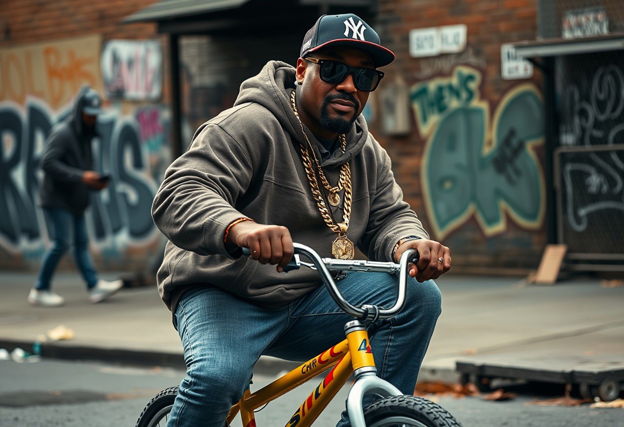 Create a highly detailed, realistic photographic image captured with an aspherical Panavision 105mm lens effect. The scene features a big, heavyset rapper with a bold hip-hop style, inspired by Snoop Dogg and 50 Cent, riding a small, colorful young boy’s bicycle. The rapper wears large gold chains with diamond accents, oversized sunglasses, and a fitted cap turned slightly to the side. His outfit includes a baggy hoodie, jeans, and classic sneakers, with visible tattoos on his forearms. His expression is cool and confident, capturing classic hip-hop swagger. In the background, set in the Bronx, is a gritty urban environment with graffiti-covered walls and a hint of street activity, including someone discreetly smuggling a small, suspicious package. The scene combines realism with a dramatic urban vibe, highlighting hip-hop culture and the street’s raw atmosphere