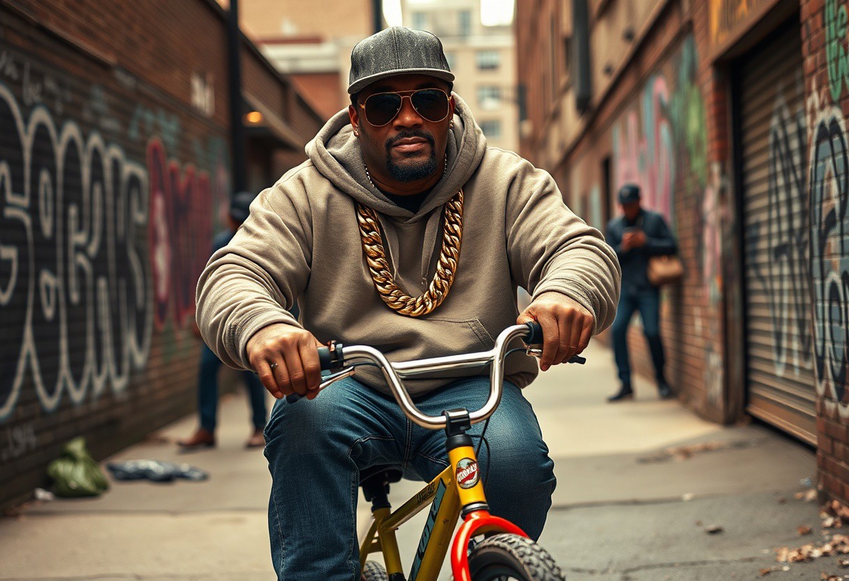 Create a highly detailed, realistic photographic image captured with an aspherical Panavision 105mm lens effect. The scene features a big, heavyset rapper with a bold hip-hop style, inspired by Snoop Dogg and 50 Cent, riding a small, colorful young boy’s bicycle. The rapper wears large gold chains with diamond accents, oversized sunglasses, and a fitted cap turned slightly to the side. His outfit includes a baggy hoodie, jeans, and classic sneakers, with visible tattoos on his forearms. His expression is cool and confident, capturing classic hip-hop swagger. In the background, set in the Bronx, is a gritty urban environment with graffiti-covered walls and a hint of street activity, including someone discreetly smuggling a small, suspicious package. The scene combines realism with a dramatic urban vibe, highlighting hip-hop culture and the street’s raw atmosphere
