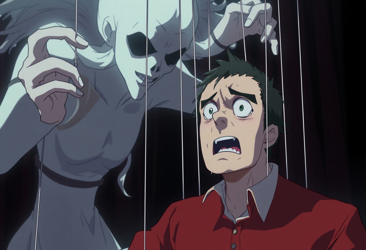 an ethereal being secretly puppeteering a man, anime, marionette strings on only one person, terrified expression, horrified,