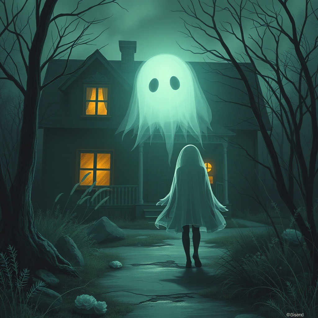 a depiction of a cute and shy ghost following an unsuspecting couple exploring an abandoned house