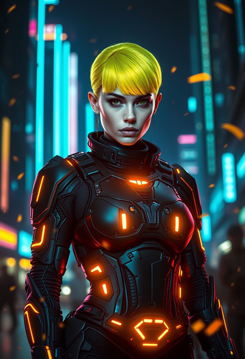 highly detailed cinematic photo, Image is a digital artwork featuring a futuristic, cyberpunk theme. The central subject is a woman with striking neon yellow hair styled in a sleek bob, wearing a high-tech, form-fitting black armored suit lit with neon lights. Her skin is pale, and her expression is serious, with piercing eyes. The suit is detailed with various mechanical components and glowing elements, particularly around the chest and waist. In the background, a dark but neon-lit cityscape is visible, with tall buildings and bright, vertical lights in shades of blue and green, adding depth to the scene. The overall composition is dynamic, with a focus on the central figure, and the color palette is dominated by vibrant colors and contrasting cool tones from the city lights.. Embers float in the air, creating a mystical and intense atmosphere