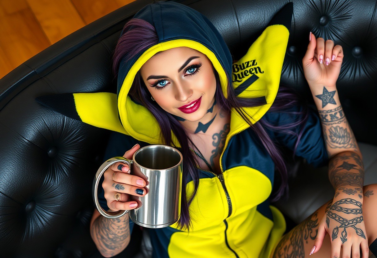 “A high-definition photo of a beautiful 20-year-old goth girl with long, dark purple hair featuring silver highlights, lying seductively on a black leather couch. She wears a dark blue and neon green Pikachu onesie with the zipper slightly open, revealing larger, fuller curves. The girl has a confident smile, with piercing blue eyes accentuated by dark eyeliner and metallic plum lipstick. Her body is adorned with numerous intricate tattoos, covering her arms, neck, and chest. She holds a large steel coffee mug, marked with a yellow lightning bolt and the words ‘Buzz Queen’ in bold. 8k detail, full body.”