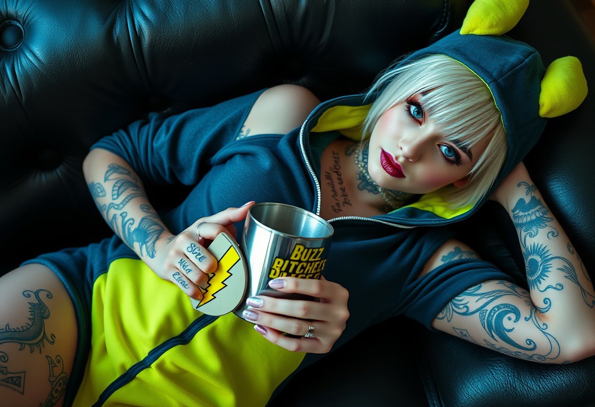 “A high-definition photo of a beautiful 20-year-old goth girl with short, platinum blonde hair, lying seductively on a black leather couch. She wears a dark blue and neon green Pikachu onesie with the zipper slightly open, accentuating her curves. Her piercing blue eyes are highlighted by dark eyeliner and metallic plum lipstick, and her body is adorned with numerous intricate tattoos on her arms, neck, and chest. She holds a large steel coffee mug with a yellow lightning bolt logo and the words ‘Buzz Bitch Please!’ in bold. 8k detail, full body.”