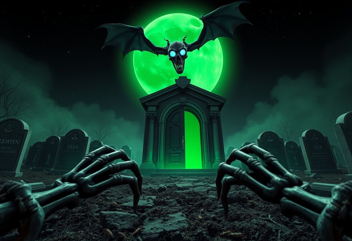 pov, the viewer crawls backwards away from what he sees. a starless nightsky dominated by a sickly green coloured moon. in the center is mausoleum with an (open door radiating an omnious pulsing green shine:1.1). the same mausoleum emits a noxious fog filling the cemetary scenery. the (mausoleum's door is crested with a prominent jack-o-lantern design:1.1). the surrounding graves are cracked open and have skeletized hands with decaying flesh and shredded shirt sleeves coverd in soil stains. gravestones with latin engravings. the gravestones engraved latters glow. bugs and spiders and snakes crawl over the gravestones towards the viewer. in the sky flies a skeletal dragon with bone wings. the dragon skull's empty eye sockets glow with a blue light as it looks straight at the viewer.