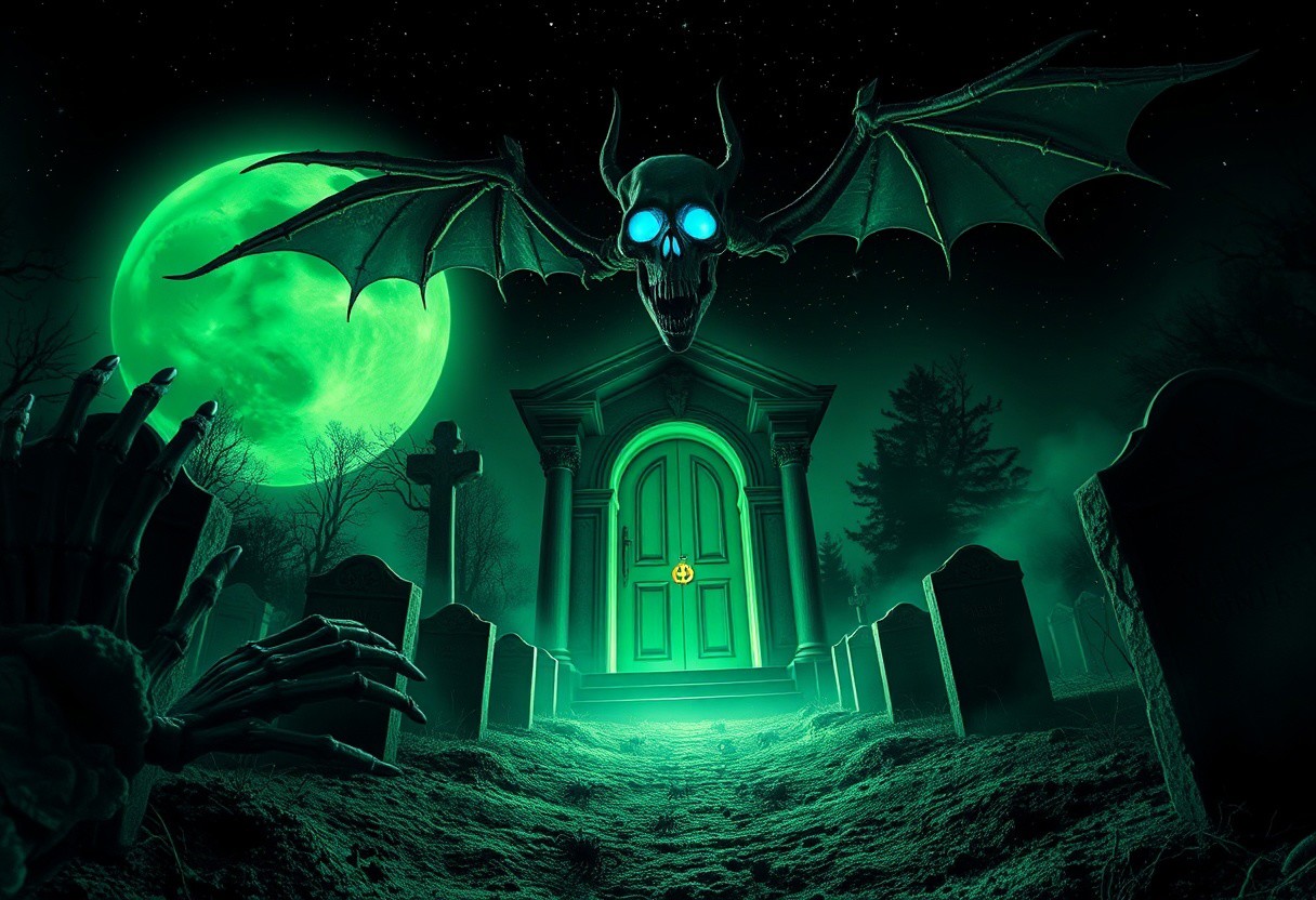pov, the viewer crawls away from what he sees. a starless nightsky dominated by a sickly green coloured moon. in the center is mausoleum with an open door radiating an omnious pulsing green shine. the same mausoleum emits a noxious fog filling the cemetary scenery. the mausoleum's door is crested with a prominent jack-o-lantern design. the surrounding graves are cracked open and have skeletized hands with decaying flesh and shredded shirt sleeves coverd in soil stains. gravestones with latin engravings. the gravestones engraved latters glow. bugs and spiders and snakes crawl over the gravestones towards the viewer. in the sky flies a skeletal dragon with bone wings. the dragon skull's empty eye sockets glow with a blue light as it looks straight at the viewer.