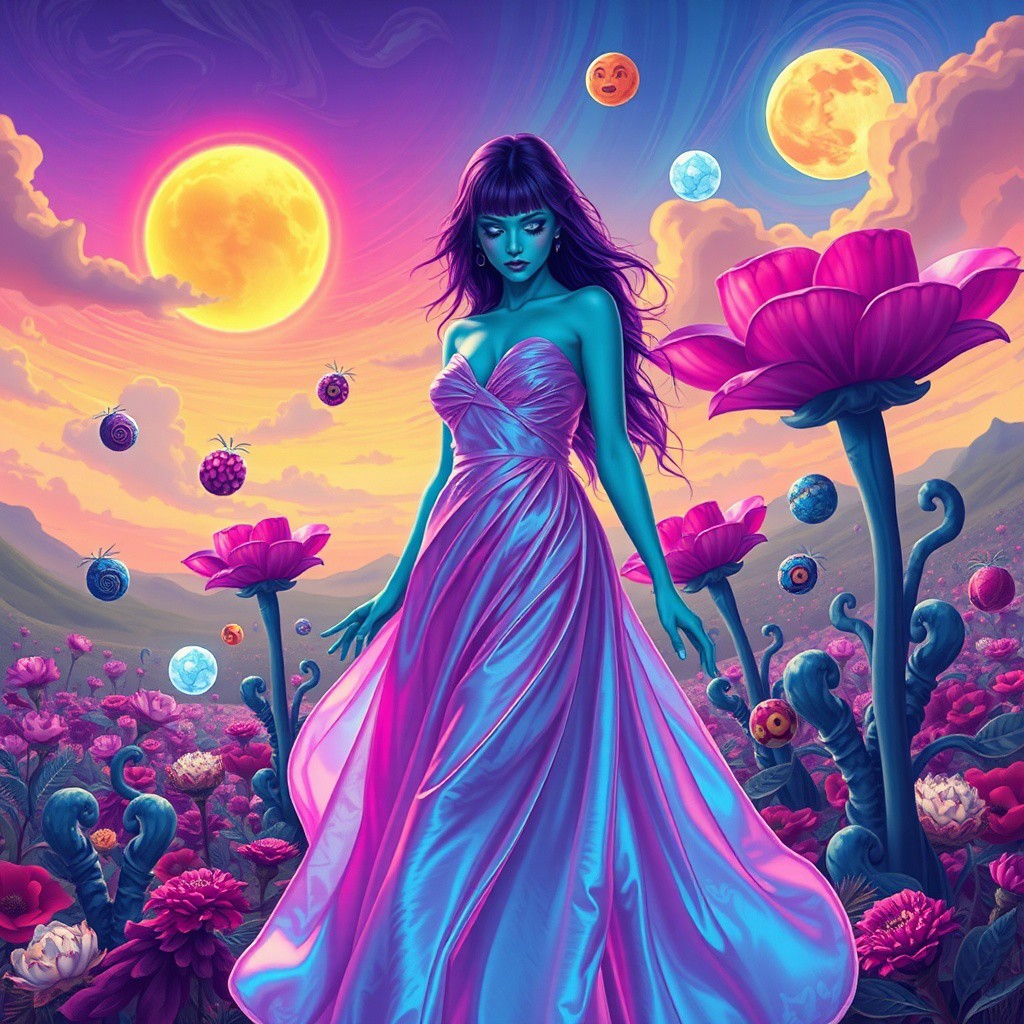 Stylised image of a beautiful woman with vibrant purple hair and glowing turquoise skin, standing in a surreal landscape. She’s wearing a flowing gown made of shimmering, iridescent fabric that reflects the colors of the bizarre environment around her. The background features a sky filled with two suns and swirling clouds in neon hues, while giant, oversized flowers with spiraling petals bloom in a whimsical garden. Strange creatures with whimsical shapes playfully interact nearby. The woman has an ethereal expression, her eyes sparkling with otherworldly light, as she gracefully floats above the ground, surrounded by floating geometric shapes and luminous orbs. The scene conveys a dreamlike, fantastical quality, blending beauty with a sense of the extraordinary.