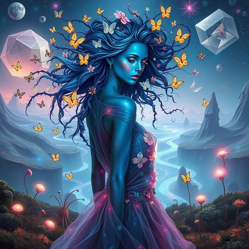 Photrealistic image of a stunning woman with iridescent skin that shifts colors from deep blue to shimmering silver, standing in a dreamlike environment. Her hair is an intricate tapestry of flowing vines and flowers, intertwining with luminous butterflies that flutter around her. The background features a bizarre landscape with gravity-defying hills and swirling rivers of liquid light. Giant, floating geometric shapes hover in the sky, casting colorful shadows on the ground. The woman wears an avant-garde dress made of translucent fabric that appears to be woven from starlight, changing form with each movement. Her eyes are multifaceted, resembling prisms, reflecting the surreal colors around her. Strange, whimsical creatures with elongated limbs and radiant patterns explore the landscape, while abstract, pulsating plants emit soft glows. The scene evokes a sense of wonder and enchantment, blurring the lines between reality and fantasy.