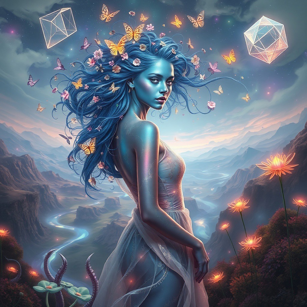 Photrealistic image of a stunning woman with iridescent skin that shifts colors from deep blue to shimmering silver, standing in a dreamlike environment. Her hair is an intricate tapestry of flowing vines and flowers, intertwining with luminous butterflies that flutter around her. The background features a bizarre landscape with gravity-defying hills and swirling rivers of liquid light. Giant, floating geometric shapes hover in the sky, casting colorful shadows on the ground. The woman wears an avant-garde dress made of translucent fabric that appears to be woven from starlight, changing form with each movement. Her eyes are multifaceted, resembling prisms, reflecting the surreal colors around her. Strange, whimsical creatures with elongated limbs and radiant patterns explore the landscape, while abstract, pulsating plants emit soft glows. The scene evokes a sense of wonder and enchantment, blurring the lines between reality and fantasy.