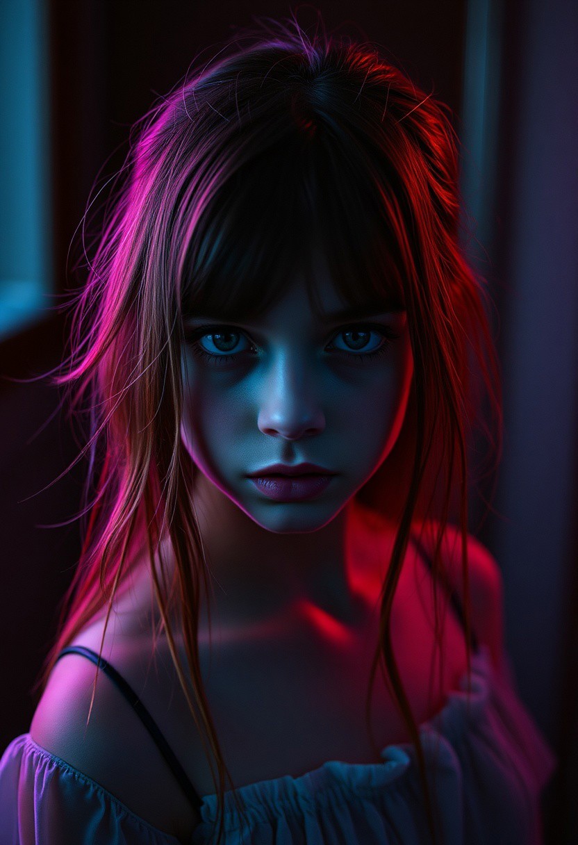 full body shot,the girl look into the camera,masterpiece, 4k, ray tracing, intricate details, highly detailed, metaphysical style Analog photo (unique surreal surrealistic photography style)(perfect emotional lighting and photography)BREAK)(hard shadows soft glow)(sharp photo)((famous historical history historiography)))(scarlet sapphire purple blue maroon blacklight colors) great lighting, dreamlike, irrational, unexpected juxtapositions, highly detailed . surreal, eerie, uncanny, detailed). surreal, eerie, uncanny, detailed cinematic light, dramatic light, shallow depth of field, vignette, highly detailed, high budget, bokeh, cinemascope, film grain, grainy