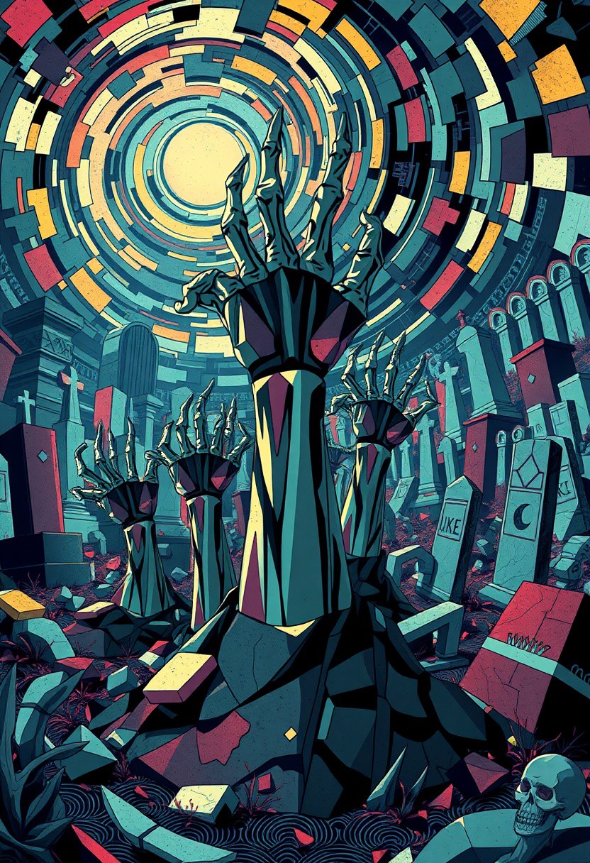 A hyper-stylized anime graveyard, blending the opulent, geometric patterns of Art Deco with the fragmented, multi-angled forms of Cubism. Zombie hands, rendered in bold, Cubist shapes and Art Deco-inspired patterns, burst forth from grave mounds, as if grasping for the living. The graveyard itself is a maze of geometric shapes and fragmented forms, with tombstones, mausoleums, and other monuments broken into multiple, overlapping planes. The background is a swirling, Cubist-inspired vortex of colors and patterns, with Art Deco motifs woven throughout. The overall effect is one of eerie, unsettling energy, as if the viewer is gazing into a fractured, nightmarish world. The zombie hands are depicted in a stylized, fragmented manner, with each finger rendered as a separate, geometric shape, adding to the sense of disjointed, Cubist chaos. highest-Quality, intricate details, visually stunning, Masterpiece