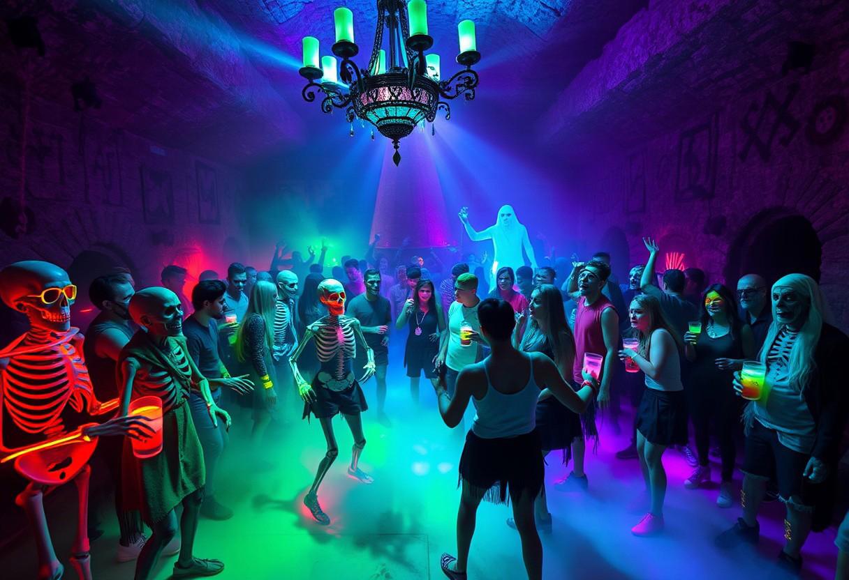 ultra-realistic thrilling Halloween rave scene in an eerie, underground crypt. The dance floor is packed with undead partygoers: skeletons in edgy attire, zombies dressed in neon, and ghostly figures floating among the crowd. The room glows with vibrant strobe lights in shades of neon green, purple, and deep blue, illuminating cryptic symbols carved into the stone walls. Fog seeps across the floor, adding a spooky, ethereal effect. DJ booths are decked with skulls, and the attendees wear glow-in-the-dark accessories like bracelets, glasses, and masks, while some carry luminescent drinks. A gothic chandelier overhead flickers, casting haunting shadows as the undead revel in the beats of the Halloween rave