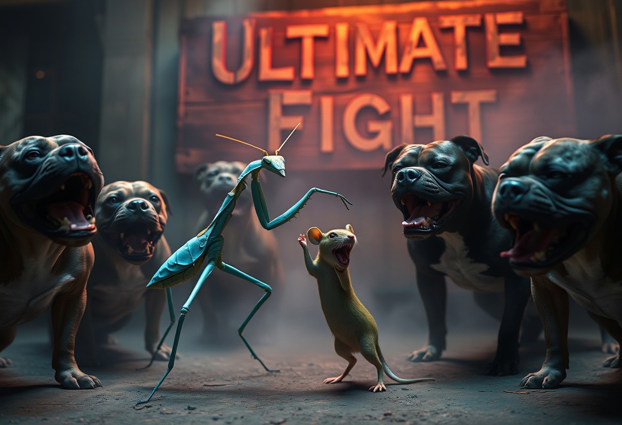 “A hyper-realistic scene of a pale blue mantis dancing gracefully with a greenish mouse, surrounded by four pitbulls barking hysterically, their expressions intense and exaggerated. The setting is captured with optics broadcast cinema anamorphic lenses, adding subtle lens flares and a slight edge blur for a filmic effect. Studio lighting highlights the intricate textures on the mantis’s limbs, the mouse’s soft fur, and the muscular build of the pitbulls, creating a surreal yet lifelike atmosphere. In the slightly blurred background, a rotten wooden sign reads ‘Ultimate Fight’ in faded letters, adding a gritty, underground feel to the scene. Neon hues and fog soften the surroundings, amplifying the eerie, dreamlike ambiance.”