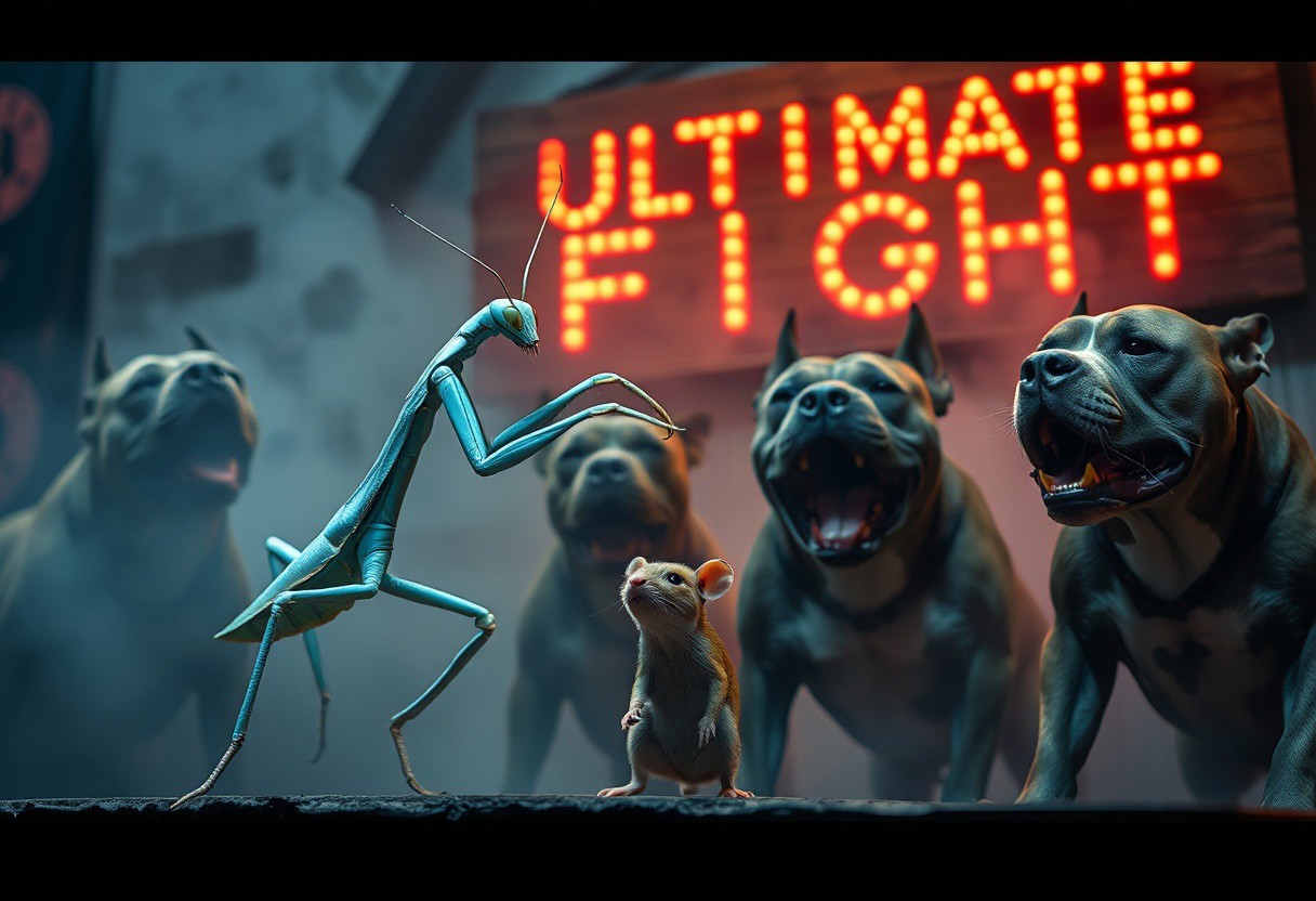 “A hyper-realistic scene of a pale blue mantis dancing gracefully with a greenish mouse, surrounded by four pitbulls barking hysterically, their expressions intense and exaggerated. The setting is captured with optics broadcast cinema anamorphic lenses, adding subtle lens flares and a slight edge blur for a filmic effect. Studio lighting highlights the intricate textures on the mantis’s limbs, the mouse’s soft fur, and the muscular build of the pitbulls, creating a surreal yet lifelike atmosphere. In the slightly blurred background, a rotten wooden sign reads ‘Ultimate Fight’ in faded letters, adding a gritty, underground feel to the scene. Neon hues and fog soften the surroundings, amplifying the eerie, dreamlike ambiance.”