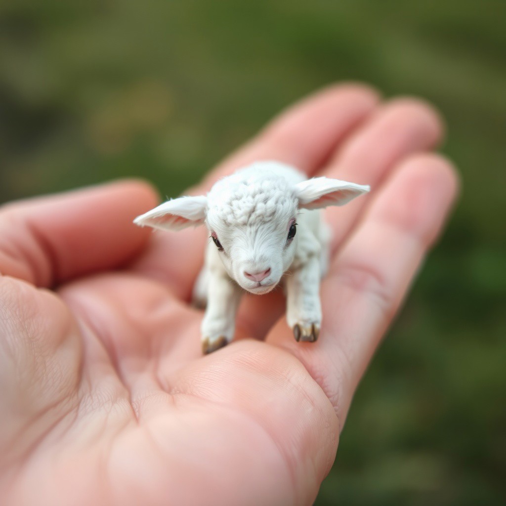 Closeup of a tiny real living lamb on palm of hand, shallow depth of field. Realistic. Blurry nature background.