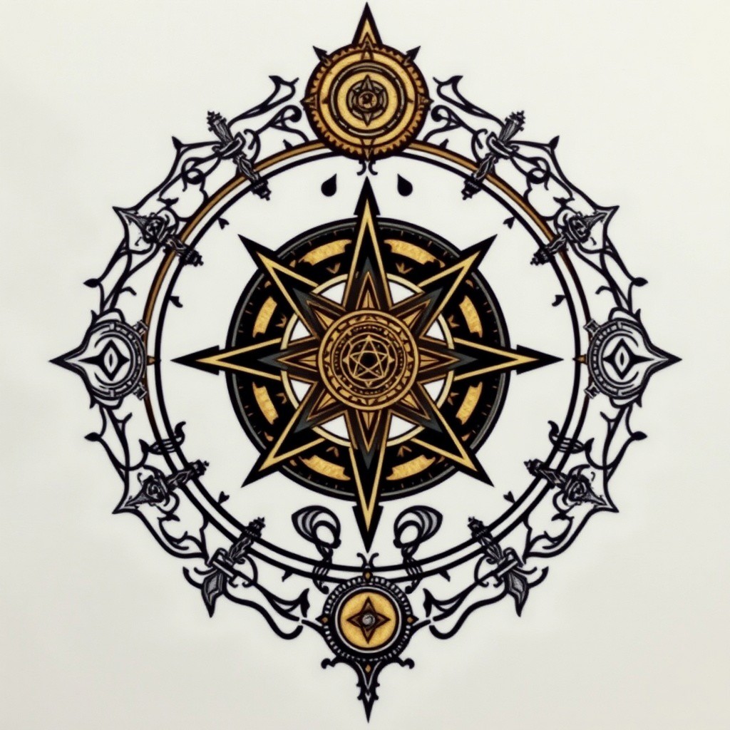 tattoo design, intricate occult symbolism, esoteric, golden dawn, thelema, chaos magick