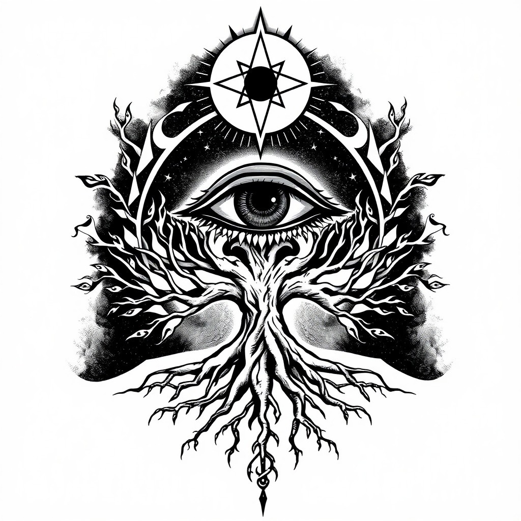 tattoo design, occult hermetic symbolism, eclipse, eye, roots, tree of life, chaos star