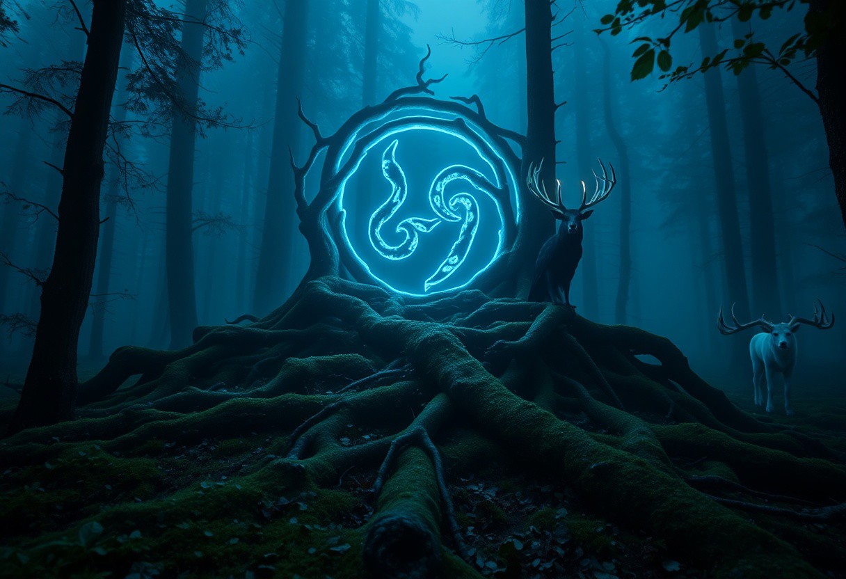“A hyper-realistic, cinematic depiction of the Algiz rune in a haunting, fog-laden ancient forest, shot with a Sony prime lens for rich depth and sharp detail. The Algiz symbol looms large, carved from twisted, bone-like branches that glow with an eerie, electric-blue hue, illuminating the mist in dramatic high contrast. This glow casts intricate shadows across the forest floor, capturing every texture of the damp moss and gnarled roots. Surrounding it are spectral animals—a raven perched on a branch with razor-sharp focus, a ghostly elk with glowing antlers standing in mid-distance, and wolf-like shadows further back, half-concealed by fog. Using a shallow depth of field, the foreground details pop in hyper clarity while the background recedes into a moody, mysterious blur, layered with deep blues, purples, and greens. Each leaf and wisp of mist is sharp, highlighting the texture and contrast of the scene for an immersive, supernatural atmosphere that feels like a ritual frozen in time.”