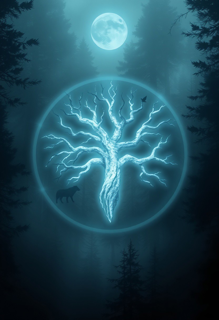 “An ethereal representation of Algiz, the rune of protection and spiritual connection. The Algiz symbol glows with a subtle white-blue aura against a backdrop of misty, dense Nordic forest. The symbol’s branches resemble ancient, weathered trees with mossy textures, glowing faintly to signify the energy of life. Around it, faint silhouettes of animals—wolves, elk, and birds—form a protective ring. The atmosphere is mystical, with hints of fog rolling through, diffusing moonlight that filters down in radiant beams, illuminating the scene. The style merges Norse mythology with a modern fantasy aesthetic, emphasizing themes of resilience, nature, and protection.”