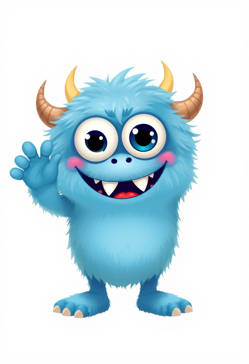 cute adorable, cute, fluffy, blue monster with large, round eyes, small horns, and a wide, toothy smile. The monster should have a friendly and playful appearance, standing on two legs and waving with one hand. The background should be plain white to make the character stand out prominently, creature with large, expressive eyes that capture a sense of wonder and curiosity. The creature's should be soft and illuminate , with shades of white that blend seamlessly with its dark surroundings.