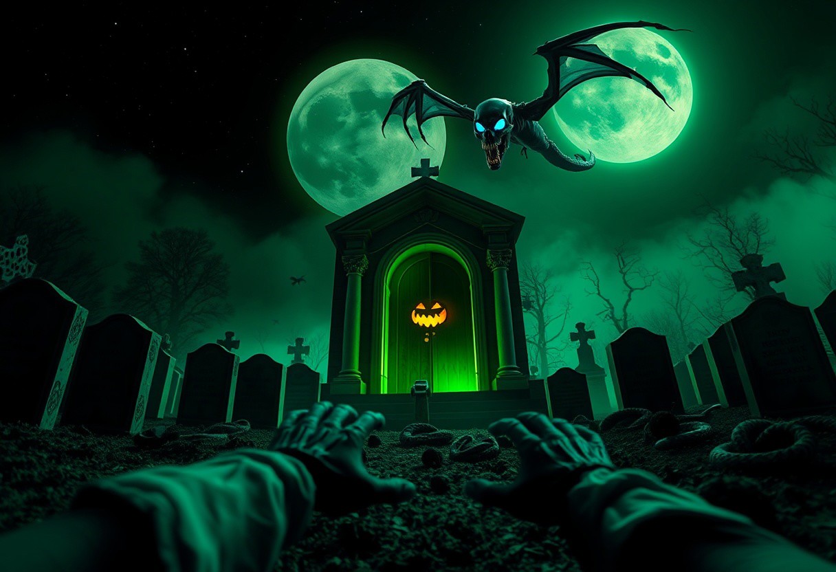 pov, the viewer crawls backwards away from what he sees. a starless nightsky dominated by a sickly green coloured moon. in the center is mausoleum with an (open door radiating an omnious pulsing green shine:1.1). the same mausoleum emits a noxious fog filling the cemetary scenery. the (mausoleum's door is crested with a prominent jack-o-lantern design:1.1). the surrounding graves are cracked open and have skeletized hands with decaying flesh and shredded shirt sleeves coverd in soil stains. gravestones with latin engravings. the gravestones engraved latters glow. bugs and spiders and snakes crawl over the gravestones towards the viewer. in the sky flies a skeletal dragon with bone wings. the dragon skull's empty eye sockets glow with a blue light as it looks straight at the viewer.