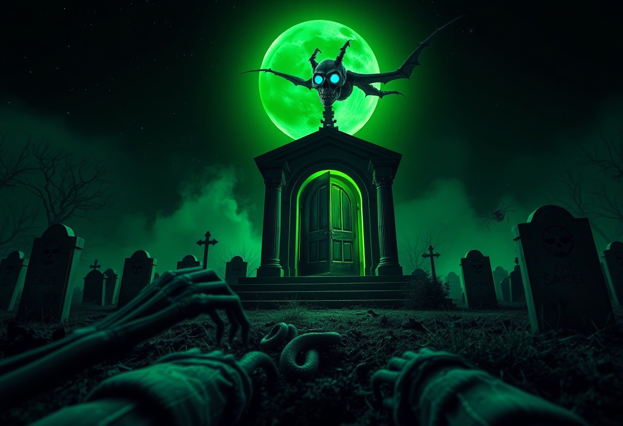 pov, the viewer crawls backwards away from what he sees. a starless nightsky dominated by a sickly green coloured moon. in the center is mausoleum with an (open door radiating an omnious pulsing green shine:1.1). the same mausoleum emits a noxious fog filling the cemetary scenery. the (mausoleum's door is crested with a prominent jack-o-lantern design:1.1). the surrounding graves are cracked open and have skeletized hands with decaying flesh and shredded shirt sleeves coverd in soil stains. gravestones with latin engravings. the gravestones engraved latters glow. bugs and spiders and snakes crawl over the gravestones towards the viewer. in the sky flies a skeletal dragon with bone wings. the dragon skull's empty eye sockets glow with a blue light as it looks straight at the viewer.