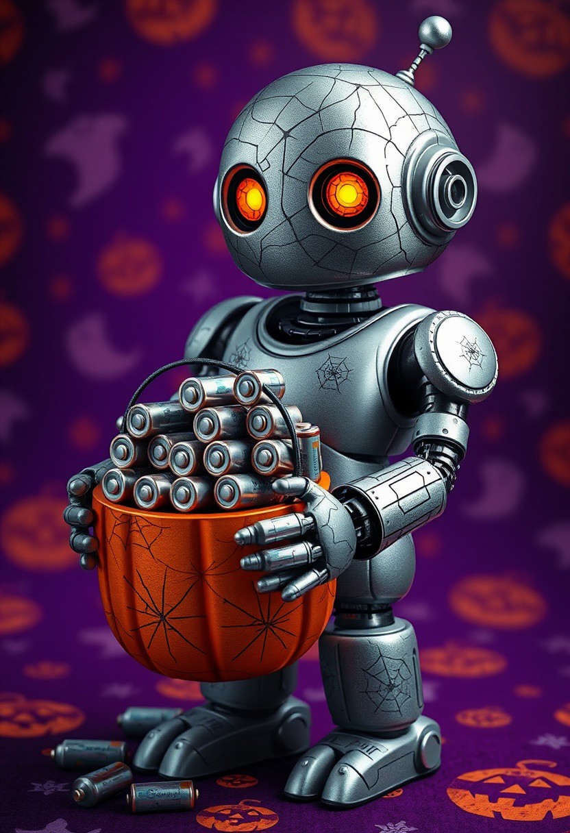 A hyper-stylized image of a spooky and cute Halloween robot, with a shiny, metallic body and glowing, orange eyes. The robot is holding a little pumpkin candy pail, but instead of candy, the pail is filled with AA batteries. The batteries are stacked up in a neat, little pyramid, with a few loose ones spilling out of the pail. The robot's body is adorned with intricate, swirling patterns of cobwebs and spiders, adding to the overall Halloween theme. The background is a deep, rich purple, with a subtle, textured pattern of jack-o'-lanterns and ghosts, adding to the overall sense of spooky, whimsical charm. The robot's expression is one of playful, mischievous innocence, as if it's enjoying the thrill of trick-or-treating, but with a twist. highest-Quality, intricate details, visually stunning, Masterpiece