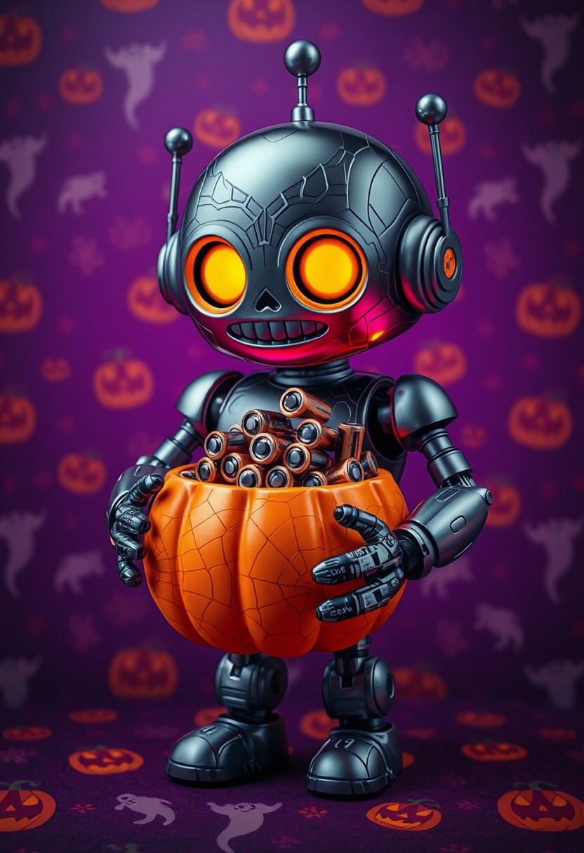 A hyper-stylized image of a spooky and cute Halloween robot, with a shiny, metallic body and glowing, orange eyes. The robot is holding a little pumpkin candy pail, but instead of candy, the pail is filled with AA batteries. The batteries are stacked up in a neat, little pyramid, with a few loose ones spilling out of the pail. The robot's body is adorned with intricate, swirling patterns of cobwebs and spiders, adding to the overall Halloween theme. The background is a deep, rich purple, with a subtle, textured pattern of jack-o'-lanterns and ghosts, adding to the overall sense of spooky, whimsical charm. The robot's expression is one of playful, mischievous innocence, as if it's enjoying the thrill of trick-or-treating, but with a twist. highest-Quality, intricate details, visually stunning, Masterpiece
