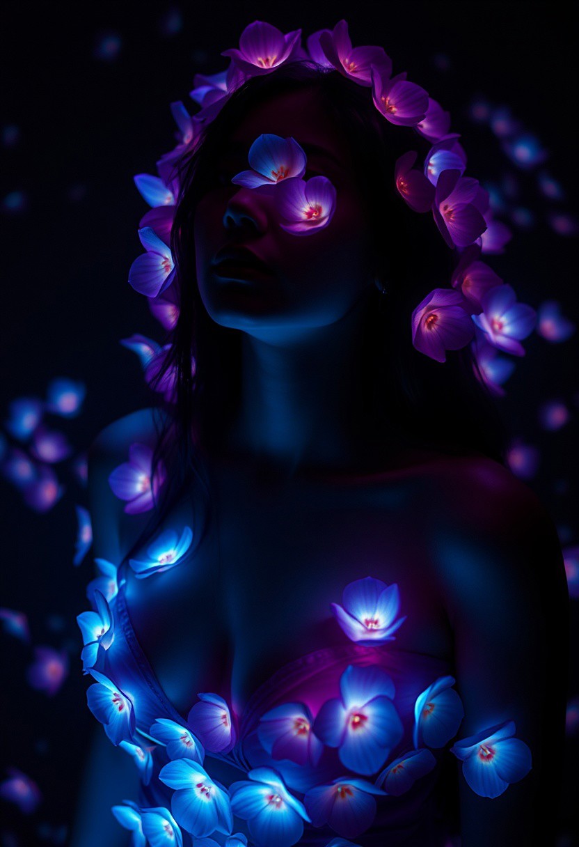 NSFW, (Soft Lighting Photography by Mimoza Veliu and Mario Giacomelli:1.2), (dark mood masterpiece Photography by Mario Giacomelli:1.2),NSFW, high quality, 8K Ultra HD, beautiful and sexy Bioluminescent woman with a slim figure medium teardrop breasts, beautiful flowing Bioluminescent flowers forming a beautiful woman, full depth of field and realistic textures, colorful, atmospheric haze, Film grain, cinematic film still, highly detailed, high budget, cinemascope, moody, epic, OverallDetail, gorgeous, 2000s vintage RAW photo, photorealistic, candid camera, color graded cinematic, eye catchlights, atmospheric lighting, imperfections, natural, shallow dof