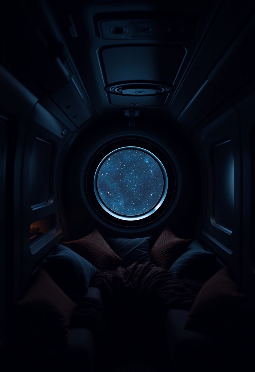 A dark, cozy spaceship compartment with dim, ambient lighting that casts a soft glow across the room. The walls are sleek and metallic, creating a quiet, enclosed atmosphere, with a comfortable seating area filled with deep-colored pillows and warm blankets. A large round window shows the vastness of space, dotted with distant stars that softly illuminate the room.