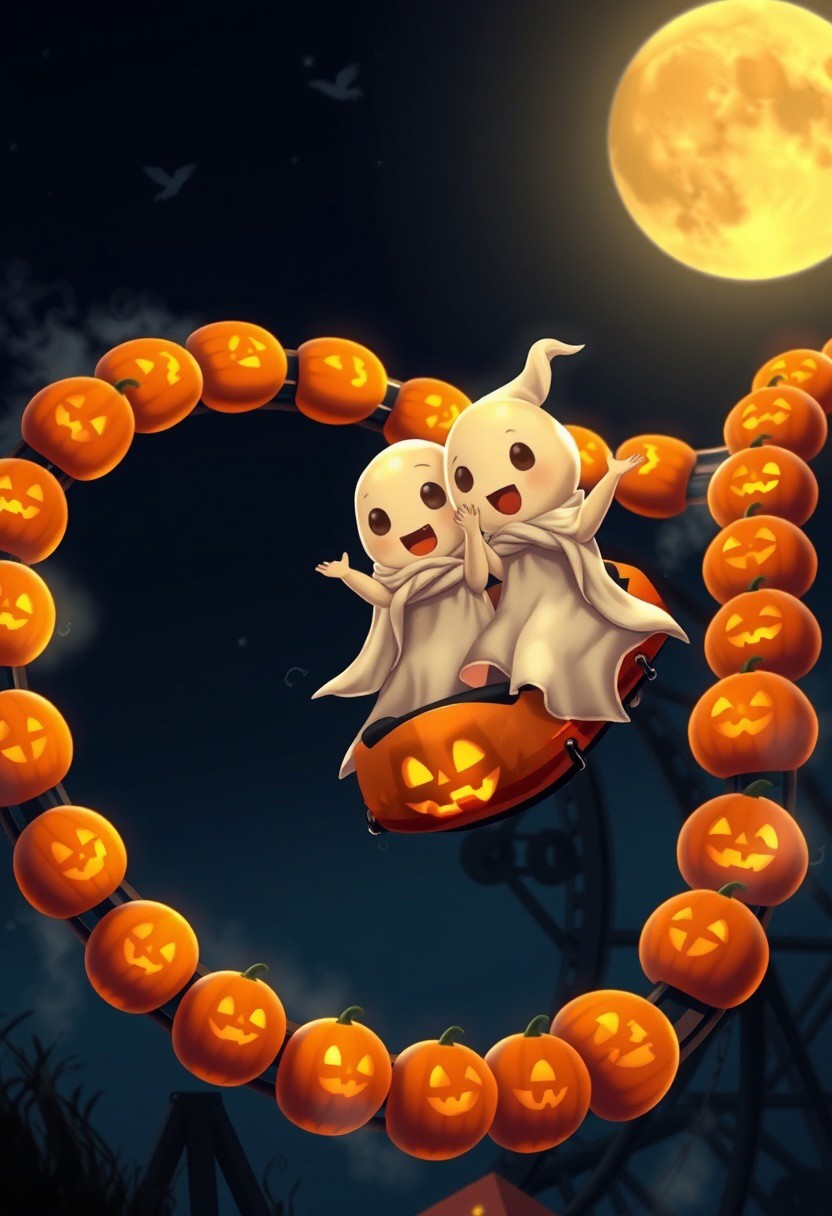 A hyper-stylized image of a couple of cute Halloween ghosts, riding in a Jack-O-Lantern Rollercoaster. The ghosts are tiny, translucent figures with adorable, smiling faces and flowing, white sheets with a few subtle, ghostly tears and tatters. The rollercoaster is a twisting, turning track of carved, glowing pumpkins, with a few wispy, ghostly strands of fog and mist adding to the overall sense of spooky, supernatural charm. The ghosts are holding hands and screaming with delight as they crest a hill and plummet down a steep, pumpkin-lined drop. The background is a deep, midnight blue, with a few subtle, starry patterns and a full moon hanging low in the sky. The overall effect is one of eerie, whimsical fun, as if the ghosts are enjoying a thrilling, supernatural ride. highest-Quality, intricate details, visually stunning, Masterpiece