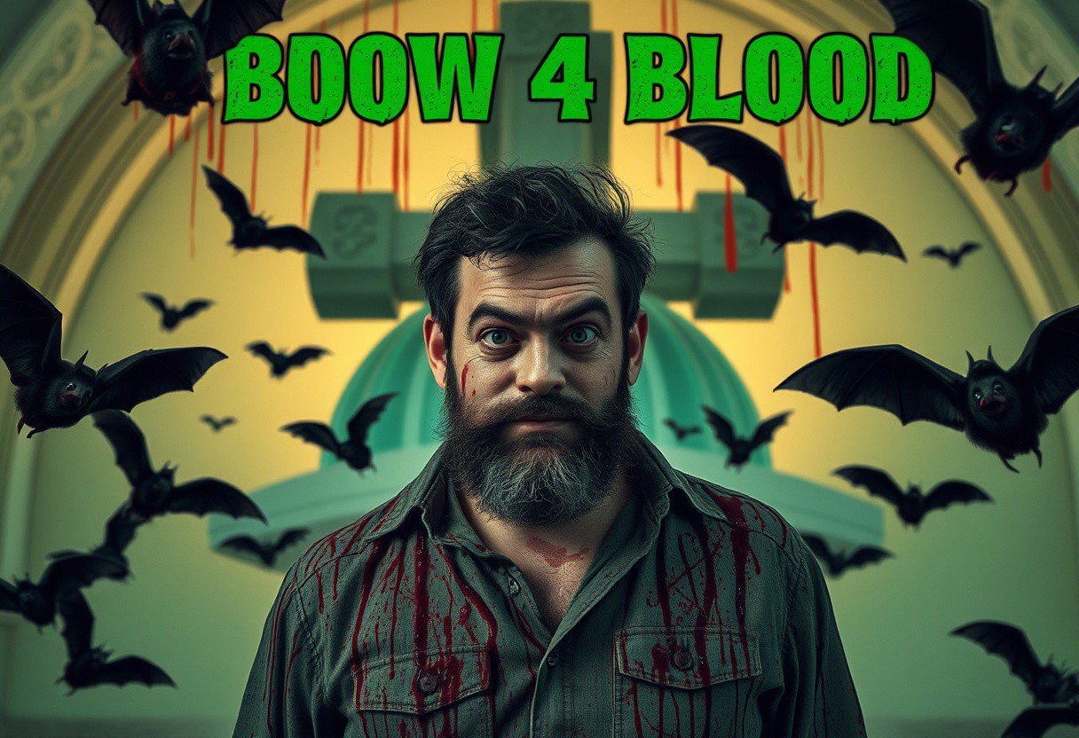 “Posaman, portrayed by Italian actor and comedian Lillo, is reimagined in a haunting, blood-drenched style, with his exaggerated, quirky poses taking on an eerie twist. Using Panavision Prime lenses, capture every detail of his expressive face, short beard, and casual-yet-confident demeanor, now with a dark, sinister edge. In the background, a massive Celtic cross looms against a pastel green dome, both streaked with dripping blood, while eerie, dark bats flap around erratically, casting unsettling shadows. His clothing, soaked in crimson splashes, adds hyper-realistic texture to the scene. At the top, the words ‘BLOW 4 BLOOD’ appear in massive green font with a pale shadow, hovering like a ghostly banner. His exaggerated, grotesque poses, surrounded by the chaos of flapping bats and blood, blend dark humor and horror, enhancing his macabre comedic style with chilling authenticity.”