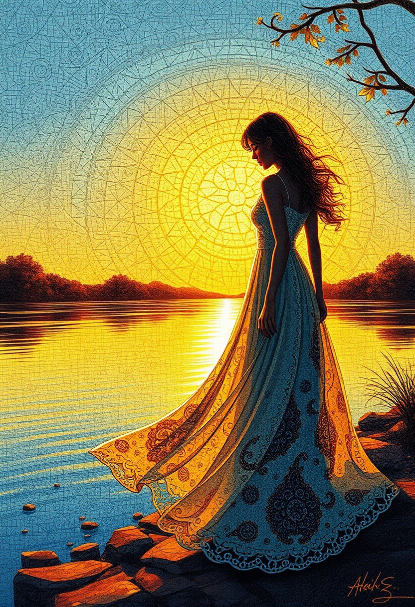 FOAM ART ZENTANGLE ART :: A Woman in a flowing blowing Foam dress standing by the river side, exquisite golden_glow of the giant setting Sun zentangle style, reflections, woman's dress shining luminously, highly imaginative exquisite whimsical fantasy Foam Art Zentangle Art in typical AI style, true representation of Foam Art Zentangle Art style