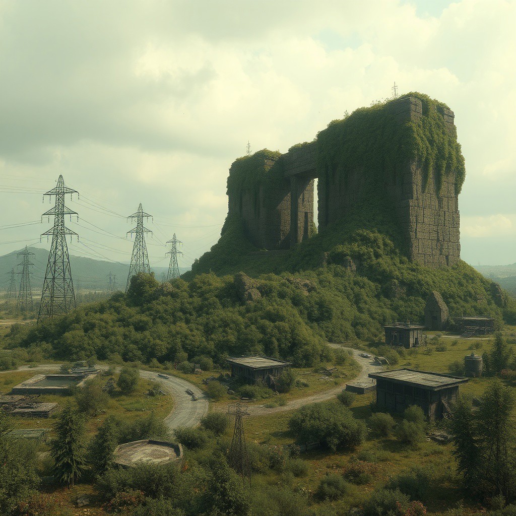 An ancient monolithic structure sits inactive and overgrown after millennia of inactivity. The ruins of infrastructure, pylons with cables dangling, buried roads, remnants of derelict buildings dot the landscape, overgrown and desolate. The landscape around it is covered in alien wildlife and flora.