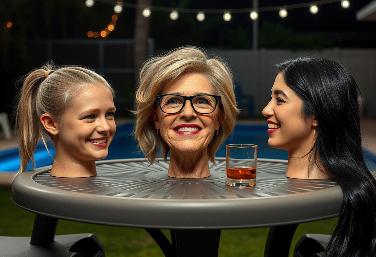 Three magically disembodied bodiless heads resting on a plastic table in a backyard at night, The chins of the bodiless heads are resting directly on the table, 1st is 18 years old, 2nd is 42 years old. 3rd is 25 years old, The 18 year old head has blonde hair in a ponytail along with acne who is blushing while smiling, hazel eyes has lots of acne and a nerdy face with no makeup. The 42 year old head also has blonde hair in a housewife hairdo and a very attractive face, along with glasses and is wearing red lipstick and is smiling while showing her teeth. The 25 year old has black hair that goes down the length of the table and she has a drink next to her and looking drunk while laughing. The three heads are looking at each other, In the background there is a backyard And a swimming pool at night all lit up. The candid photo quality is that of an iPhone pro photo quality. no plastic, no dolls, no mannequins, no fake heads, hyper realistic skin.