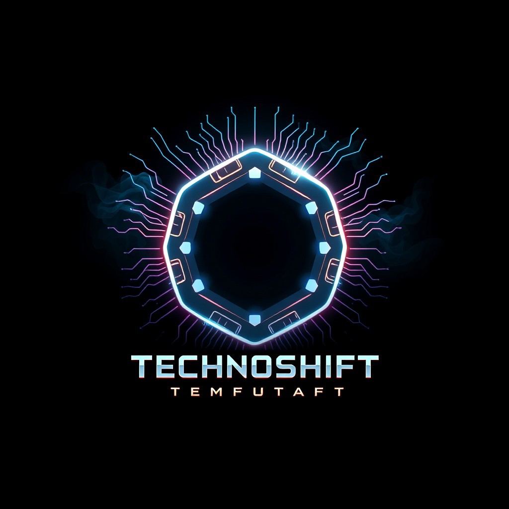 A sport team logo, minimalist style A sleek, hexagonal digital core with electric circuits radiating out like sunbeams, with one side blending into swirling, dark mist. The circuits shift into arcane symbols as they fade, creating a sharp contrast between tech and magic. The name "Technoshift" is etched into the lower part of the hexagon in futuristic, glitching text, with small glowing runes beneath.