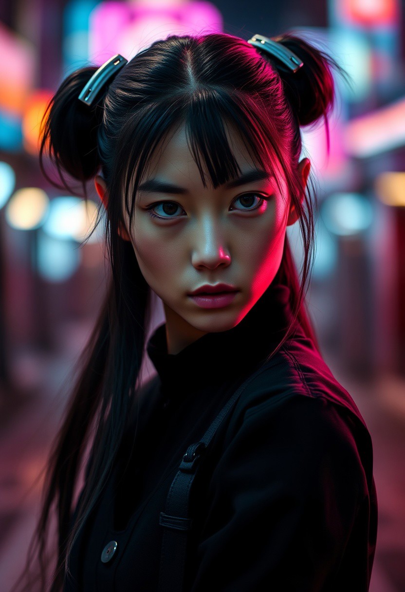 A high-resolution, realistic portrait photo of a young woman with striking features, captured with exceptional detail and professional lighting. Her intense, serious gaze is directed at the viewer, conveying readiness and determination. She has long, jet-black hair styled in high pigtails with metallic clips, adding a modern edge. A single katana hilt should be visible, positioned naturally across her back without touching her shoulder, as if sheathed. The hilt should be detailed but not appear to emerge directly from her clothing. Her black attire should be sleek, with small buttons that add style without distracting from her expression. Lighting should be cool and atmospheric, with soft shadows highlighting her facial structure. Subtle reflections of pink and teal neon lights should add vibrancy without overpowering her natural skin tone, which should display realistic textures, like subtle pores, for lifelike detail. The background should be softly blurred with colorful bokeh lights, creating a cinematic, nighttime cityscape. The bokeh should be muted to maintain focus on her face. Fine particles, like light raindrops or dust, can be visible in the air, enhancing the atmosphere without detracting from her gaze. Render this image with the highest level of detail, capturing realistic textures, balanced lighting, and a color scheme that maintains a serious, intense mood.