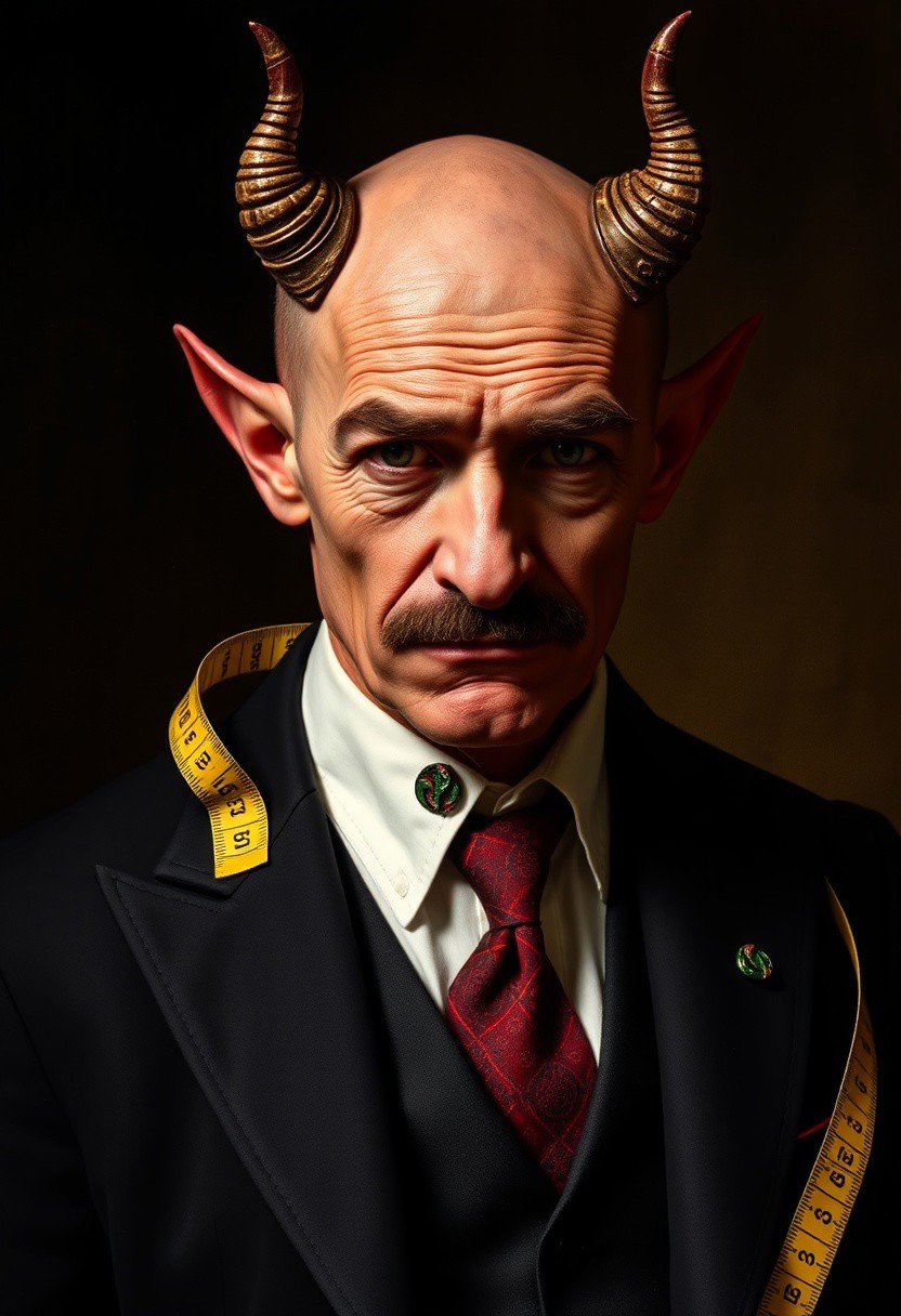 Three-quarter portrait of the devil dressed as a young tailor. He is bald with a small curly dark brown and grey handlebar moustache. Black three-piece suit, white shirt, red patterned tie. ((A pin of a green snake is on his jacket lapel.)) His face is wrinkled and red. Devil horns. He drapes a yellow tape measure at the sides of his neck like a scarf. Rembrandt Lighting style, shadow, partially covered in shadow, Rembrandt shadow style, nose shadow.