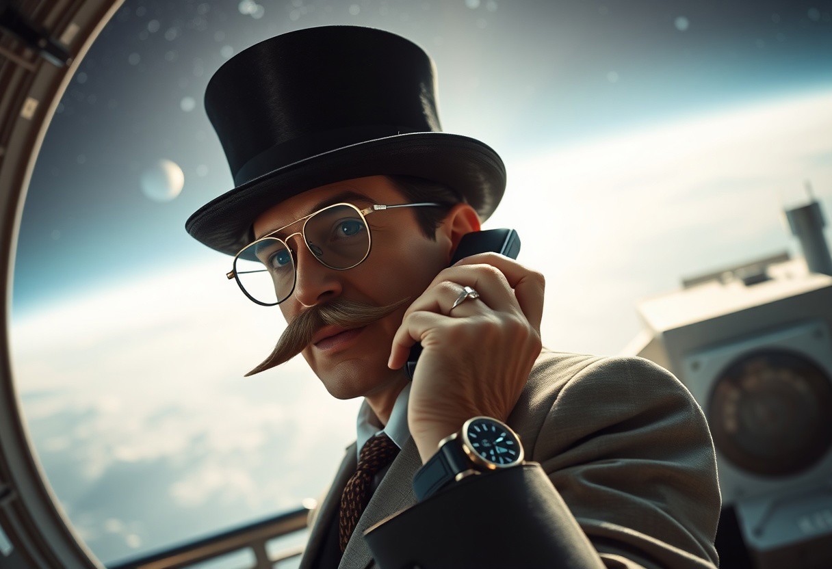 A rich person with a monocle, a moustache and a top hat, is staning on a space station. 1950s style. The person has a hologram watch, wich he is taking a phone call with. The monocle has only one glass.