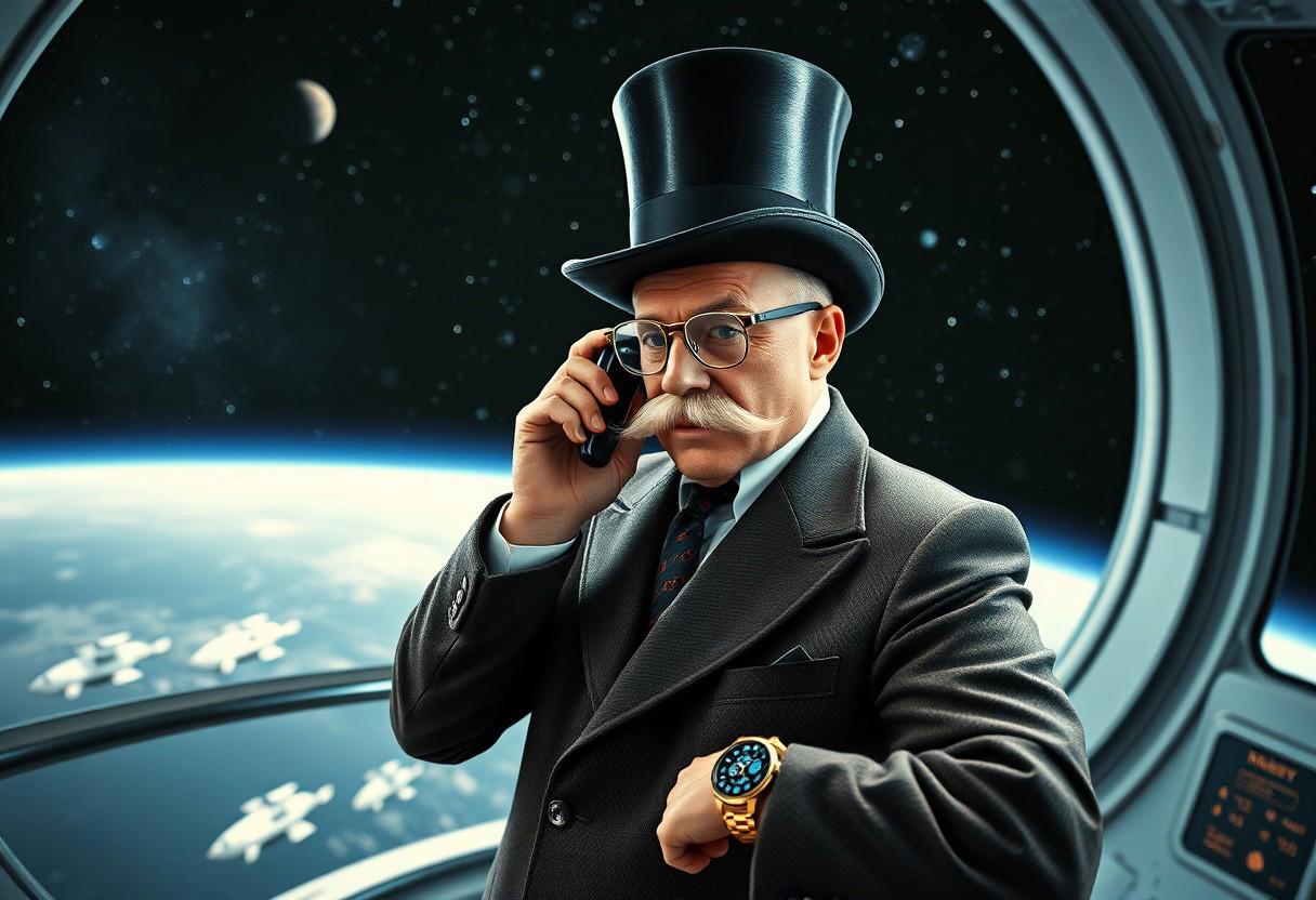 A rich person with a monocle, a moustache and a top hat, is staning on a space station. 1950s style. The person has a hologram watch, wich he is taking a phone call with. He is not wearing glasses. He wars only a moncole, wich are glasses with only one lens.