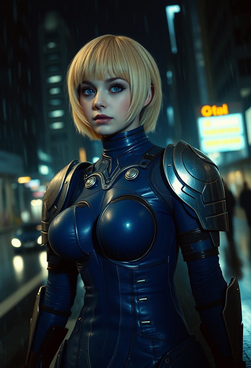 photograph, a professional, 1girl, solo, large breasts,blonde hair, short hair, blue eyes, armor, blue bodysuit, pauldrons, science fiction, city, night, rain, from below, half-closed eyes, from behind, ass Ilford FP4 125, vanishing point,