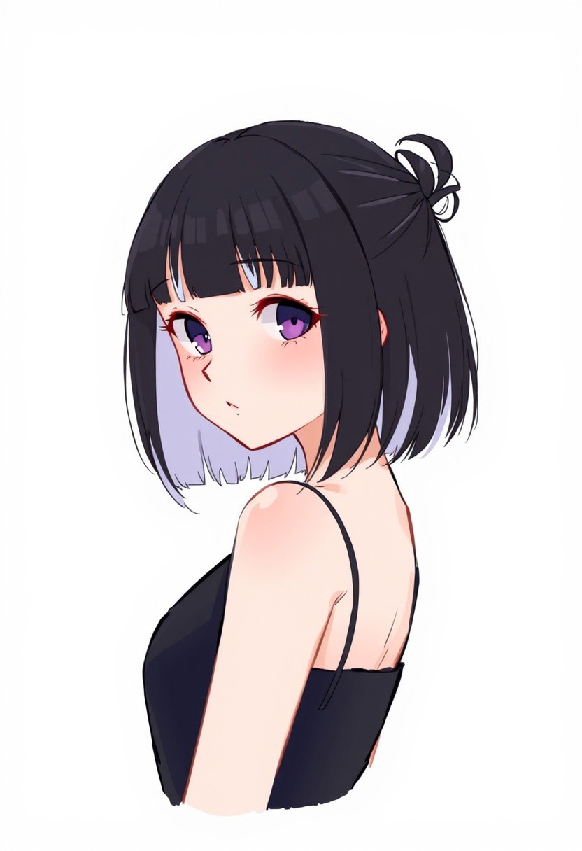 1girl, solo, breasts, looking at viewer, short hair, black hair, dress, closed mouth, medium breasts, upper body, white hair, multicolored hair, sleeveless, blunt bangs, hair bun, black dress, two-tone hair, streaked hair, from side, lips, makeup, bob cut, single hair bun, nose
