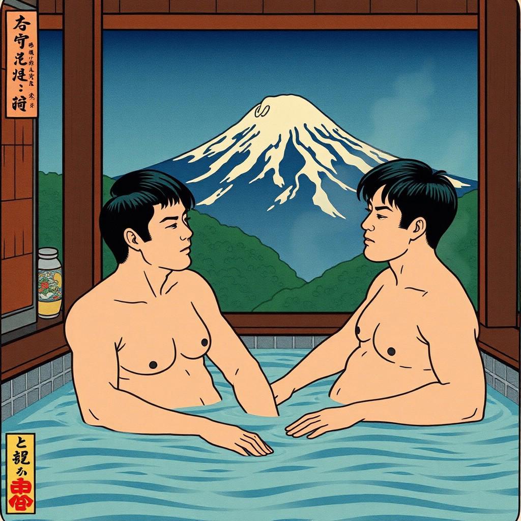 fauvism, ukiyo-e print, male nudes, Their brawniness (at times) is lovely. Handsome Japanese men bathing in an onsen with a mountain behind them