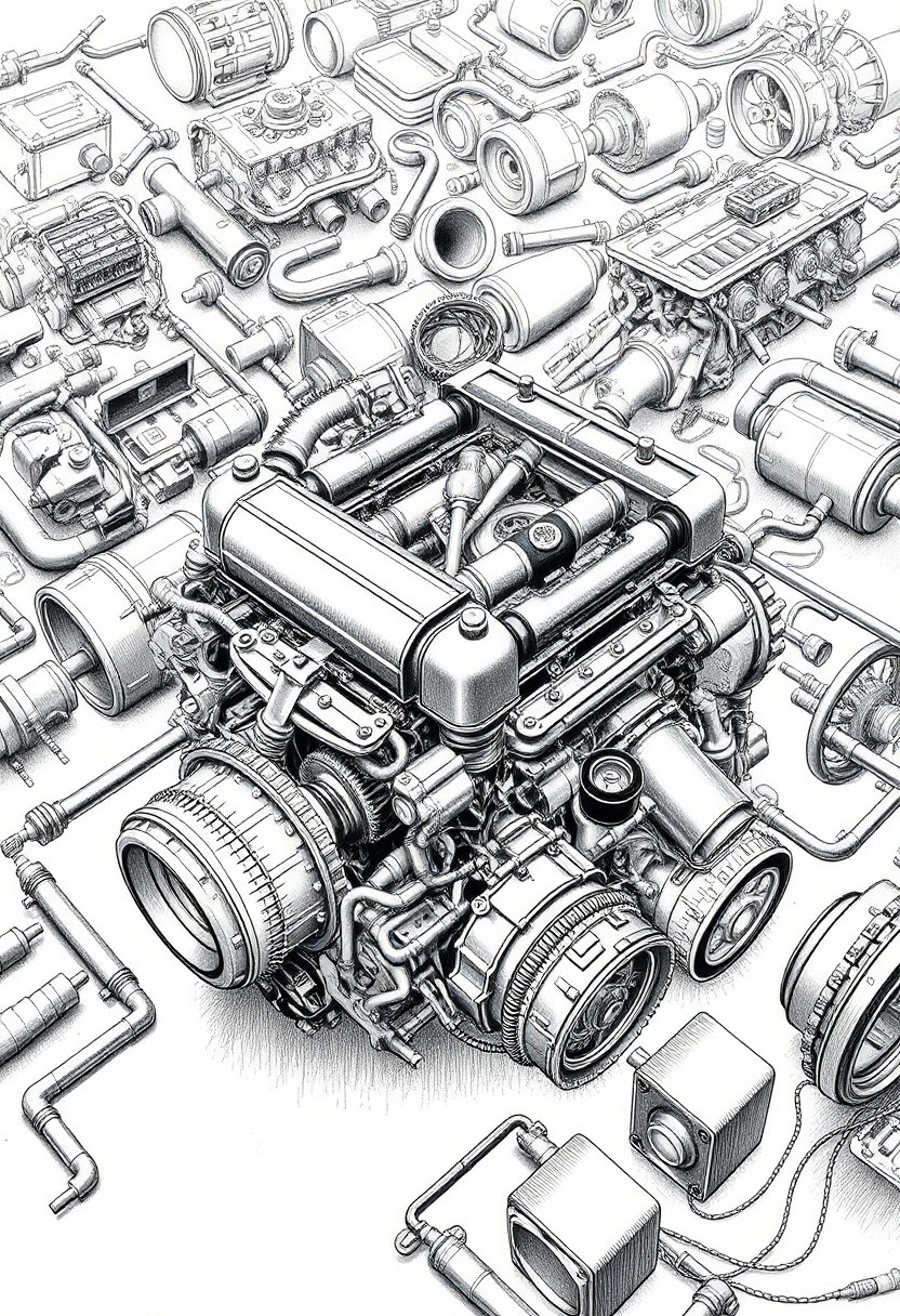 a technical drawing of a disassembled car engine in the style of Peter Aschwanden, engine parts spread out in the background, car parts, multiple pieces, overwhelming array of parts, highly detailed and intricate