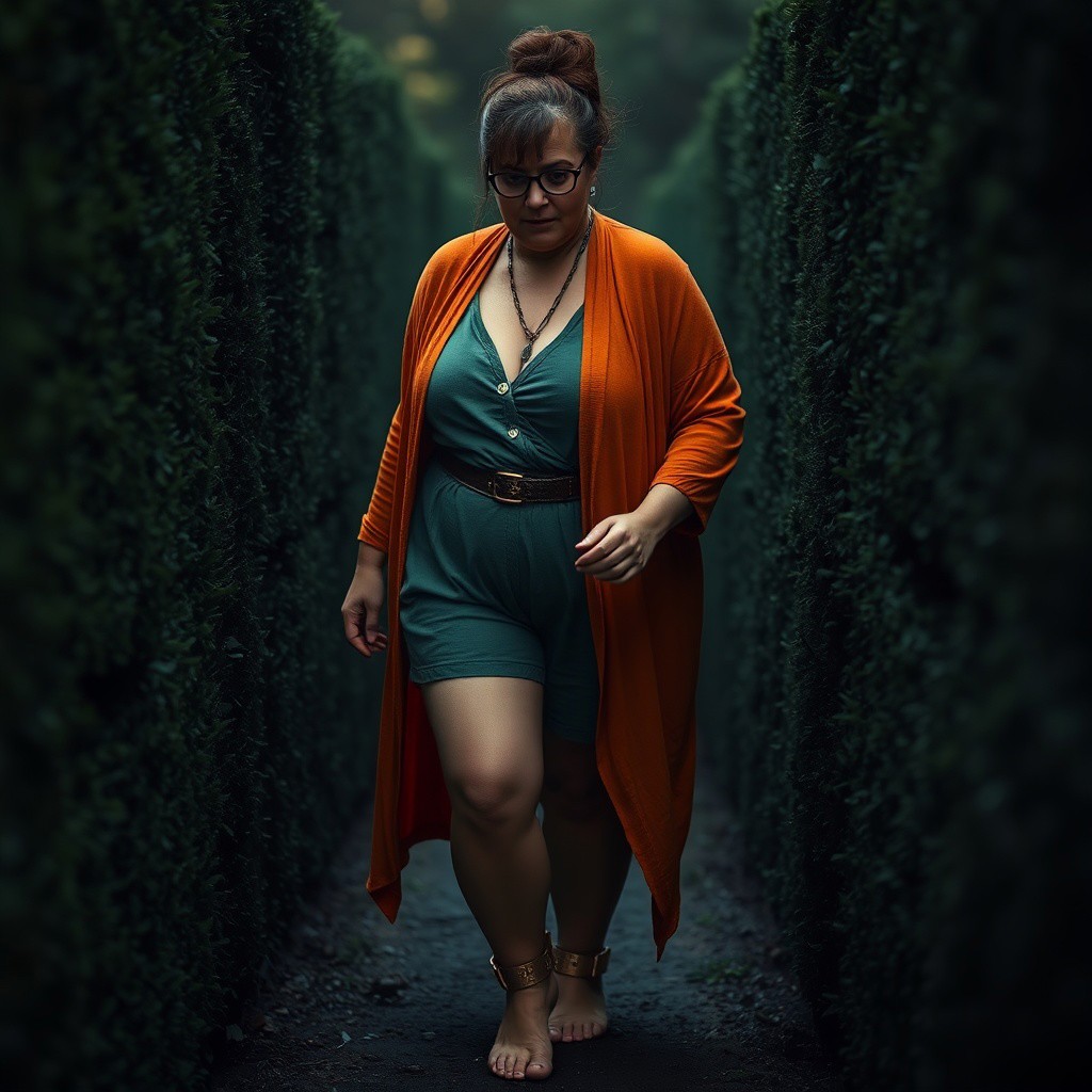 Cinematic masterpiece of a Plus size older Scottish woman glasses light brown curly bun Orange draping cardigan. green linen high cut romper hugs her curvy thick thighs. . Brass Shackles with glowing runes etching on the bands are locked on her ankles. She steps barefoot carefully navigates the hedge maze in the darkness