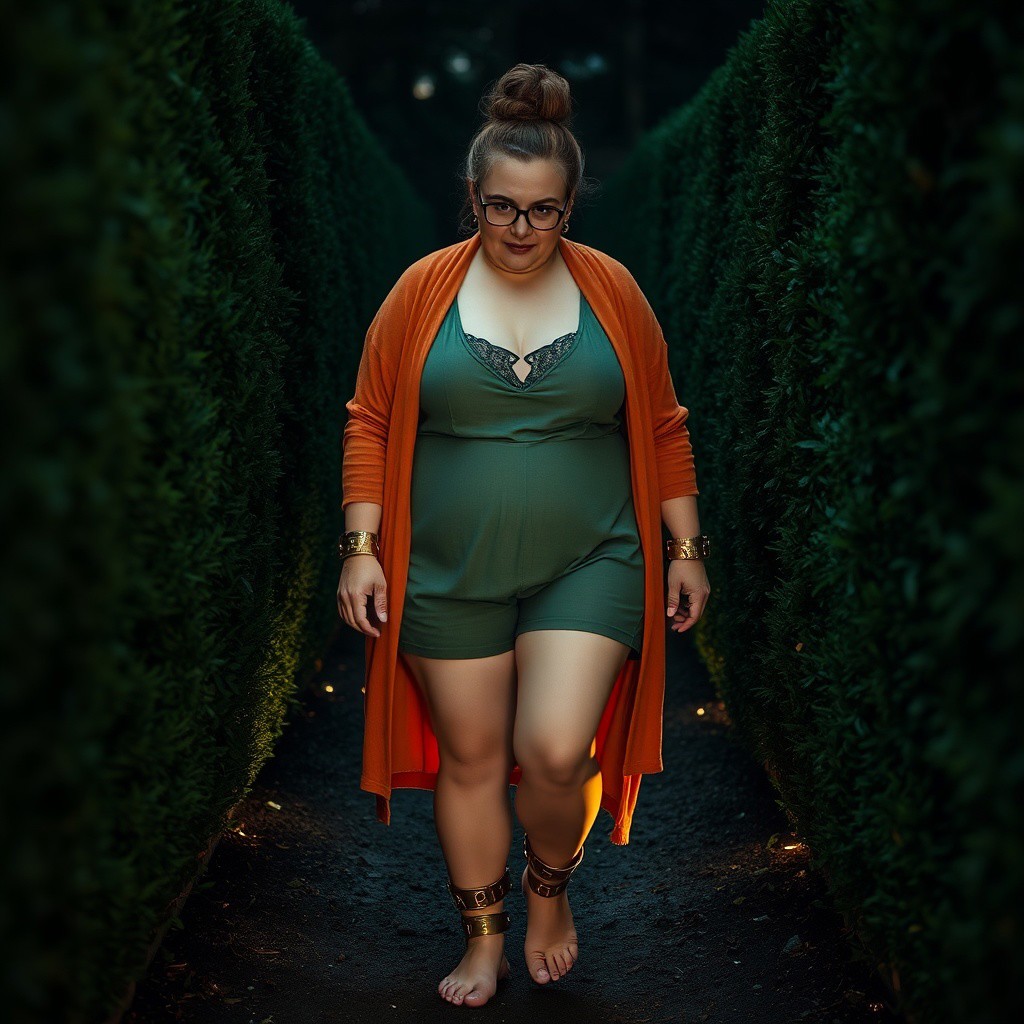 Cinematic masterpiece of a Plus size older Scottish woman glasses light brown curly bun Orange draping cardigan. green linen high cut romper hugs her curvy thick thighs. . Brass Shackles with glowing runes etching on the bands are locked on her ankles. She steps barefoot carefully navigates the hedge maze in the darkness
