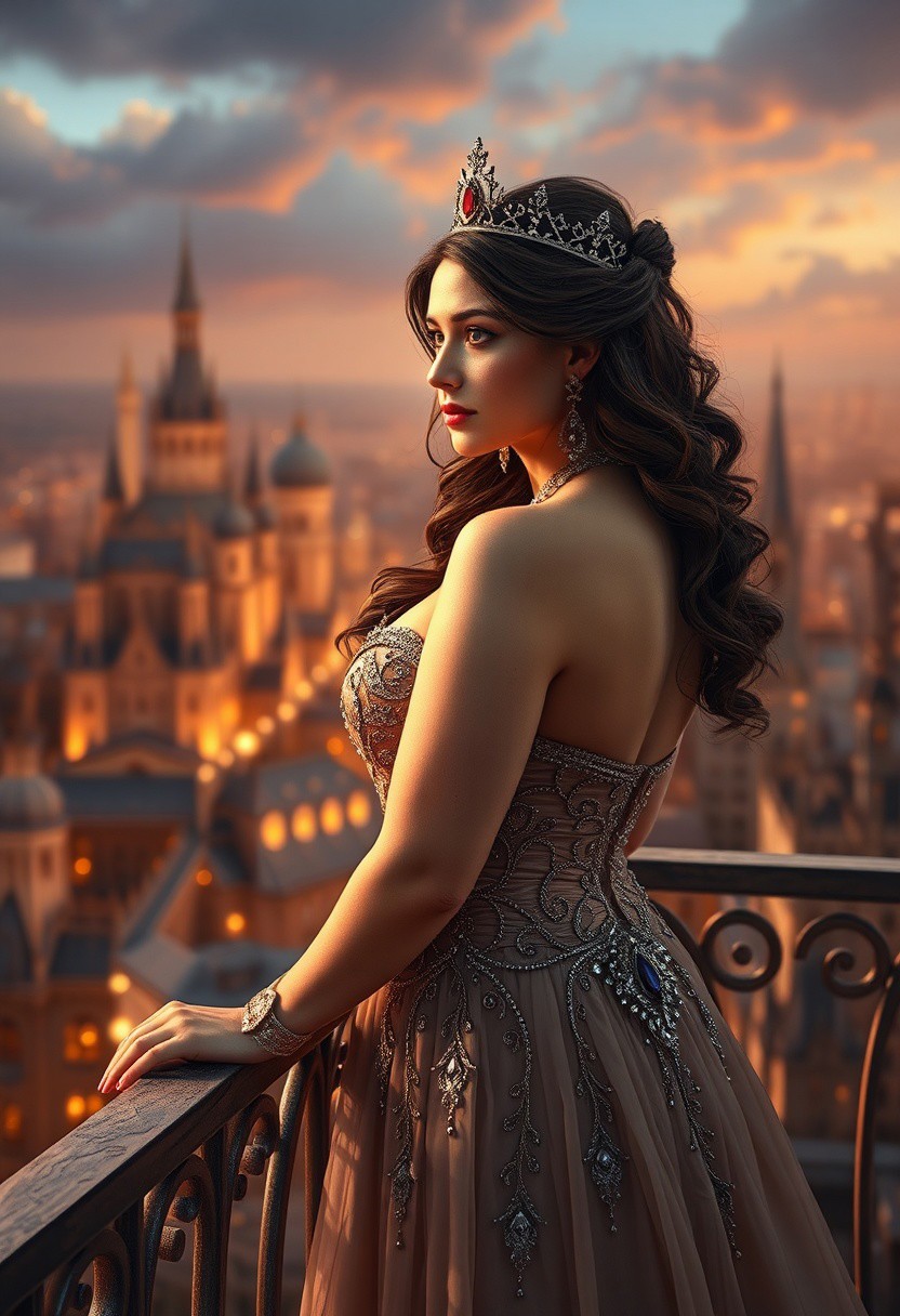 A photorealistic, high quality, finely detailed still of an attractive, full figured female wearing a rfdrss dress. She is out on a balcony looking out over a fantasy style city, a crown on top of head and decked out in stunning jewellery.