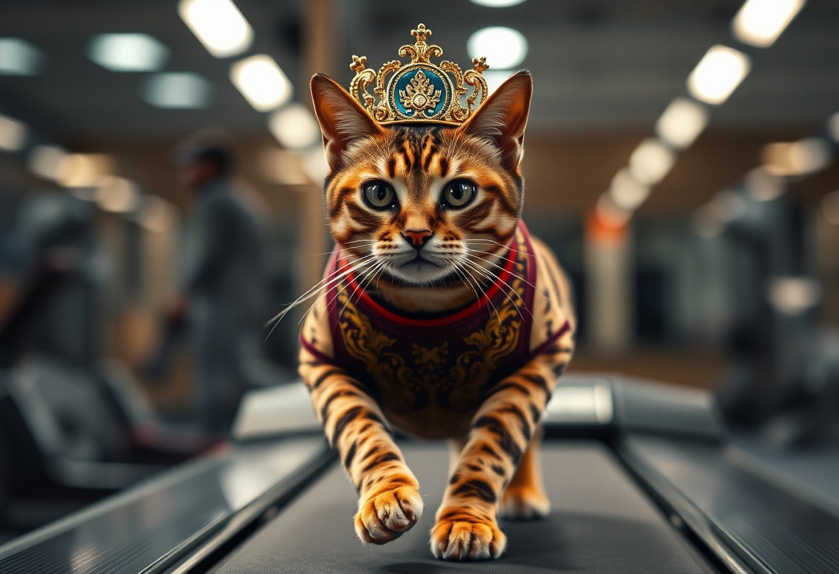 “A majestic Bengal cat wearing a delicate golden crown, dressed in a fitted, high-quality gymnast suit with intricate textures and vibrant colors, running on a treadmill. Captured in high resolution with a Panavision 105mm lens for a cinematic, hyper-detailed look. The scene is set in a polished gym environment, featuring realistic lighting that accentuates each detail of the cat’s fur, the suit’s fabric, and the subtle reflections on the treadmill. Deep, cinematic colors and dynamic lighting emphasize the regal and focused expression of the cat, with every whisker, fur strand, and fabric fold rendered in sharp clarity.”